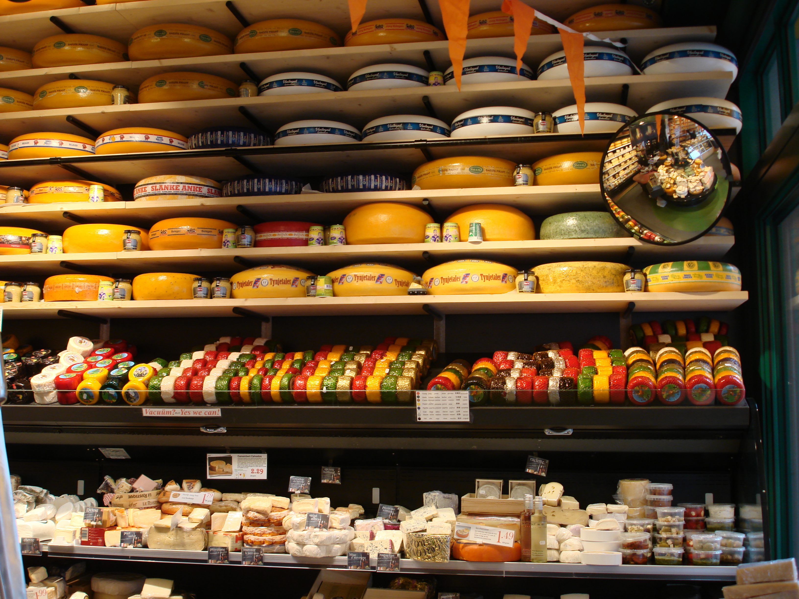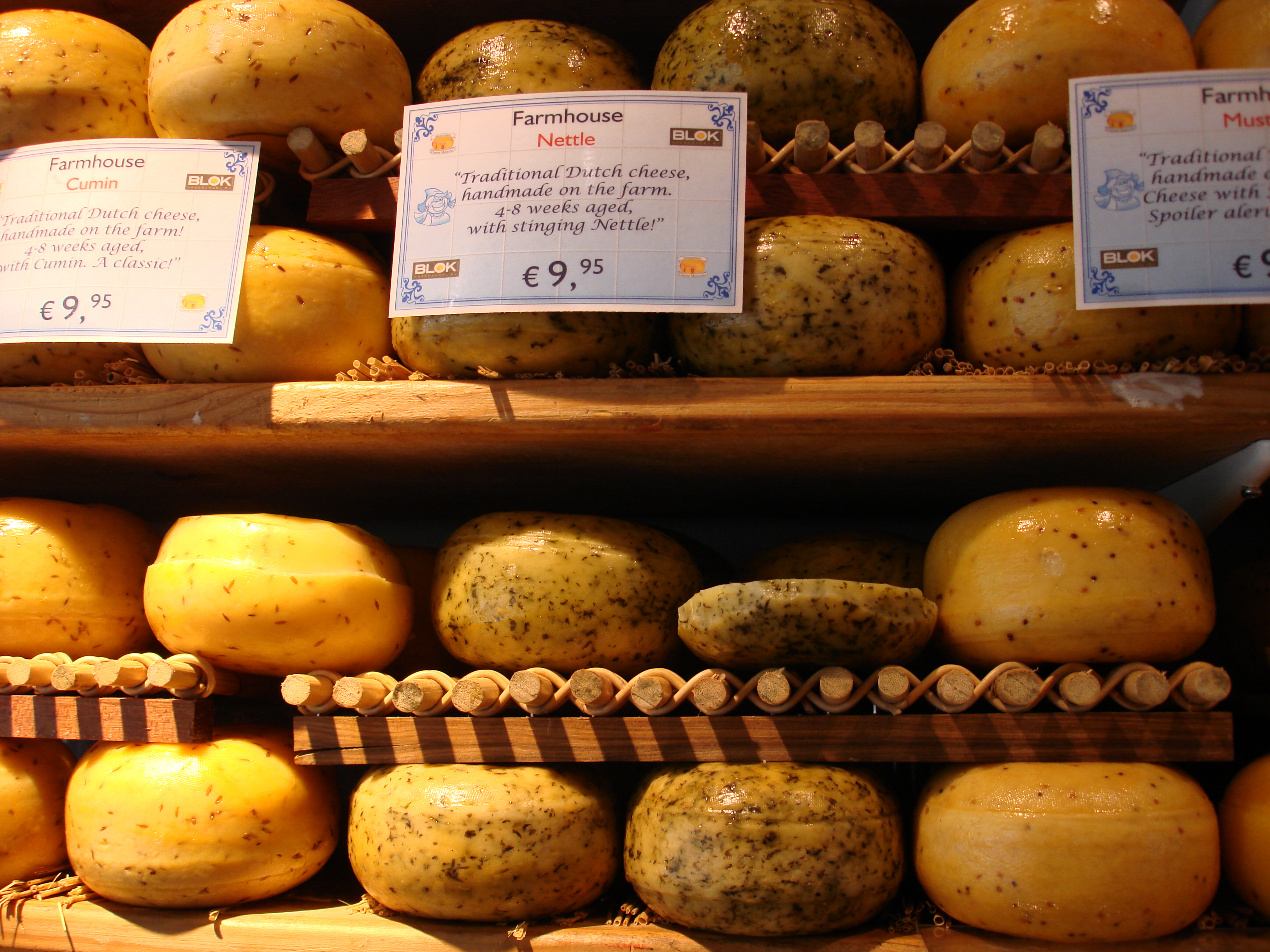 After slim pickings on the cheese in art front I turned my attention to the artistry of cheese shops. The produce on offer was green, red, orange, brownish, almost white, and every shade of yellow. Row upon row of Edam and Gouda flavoured with different herbs, spices and weeds. Given my interest in edible weeds, of course I had to try what was described as a farmhouse lunch cheese made with nettles. And yes, it did taste very good.