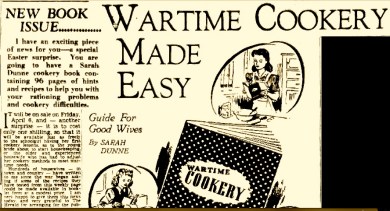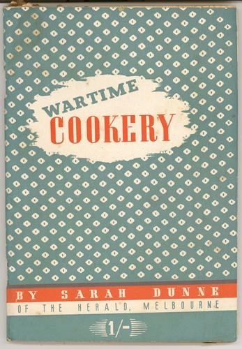 My other World War II cookbook is an Australian one. Also called Wartime Cookery, it’s by journalist Sarah Dunne and was published by the Herald (Melbourne) in 1945. Ninety-six pages of hints and recipes to help you with your rationing problems and cooking challenges. Phosphate as a raising agent, ‘Friendly Ways With Suet’, instructions for ‘Red Flannel Hash’ and ‘Moonshine Mould’. According to the publicity blurb waste was a subtle form of treason. And as guardians of the Home Front, housewives should be prepared for ‘strange forages and unusual adventures’ of the kind offered by this collection of recipes where familiar ingredients are made to do unfamiliar things.