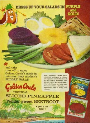 Golden Circle began as a growers’ cooperative. The pineapple cannery commenced production in 1947. That same year, to celebrate the marriage of the future Queen Elizabeth, the Queensland State Government shipped five-hundred cases of tinned pineapple to London.The company’s advertising took a practical, recipe-based approach. Housewives were encouraged to keep their menfolk happy with canned pineapple—Glazed Pineapple & Sausages; Pineapple Atolls; Macaroni Cheese Tropical; Frozen Pineapple Crunch, and many more culinary gems. In the 1950s and 60s the Australian Women’s Weekly ran the brand’s colourful ads in just about every issue. Like this one from October 1964 which features the alarmingly-named ‘Busy Housewife Salad’.