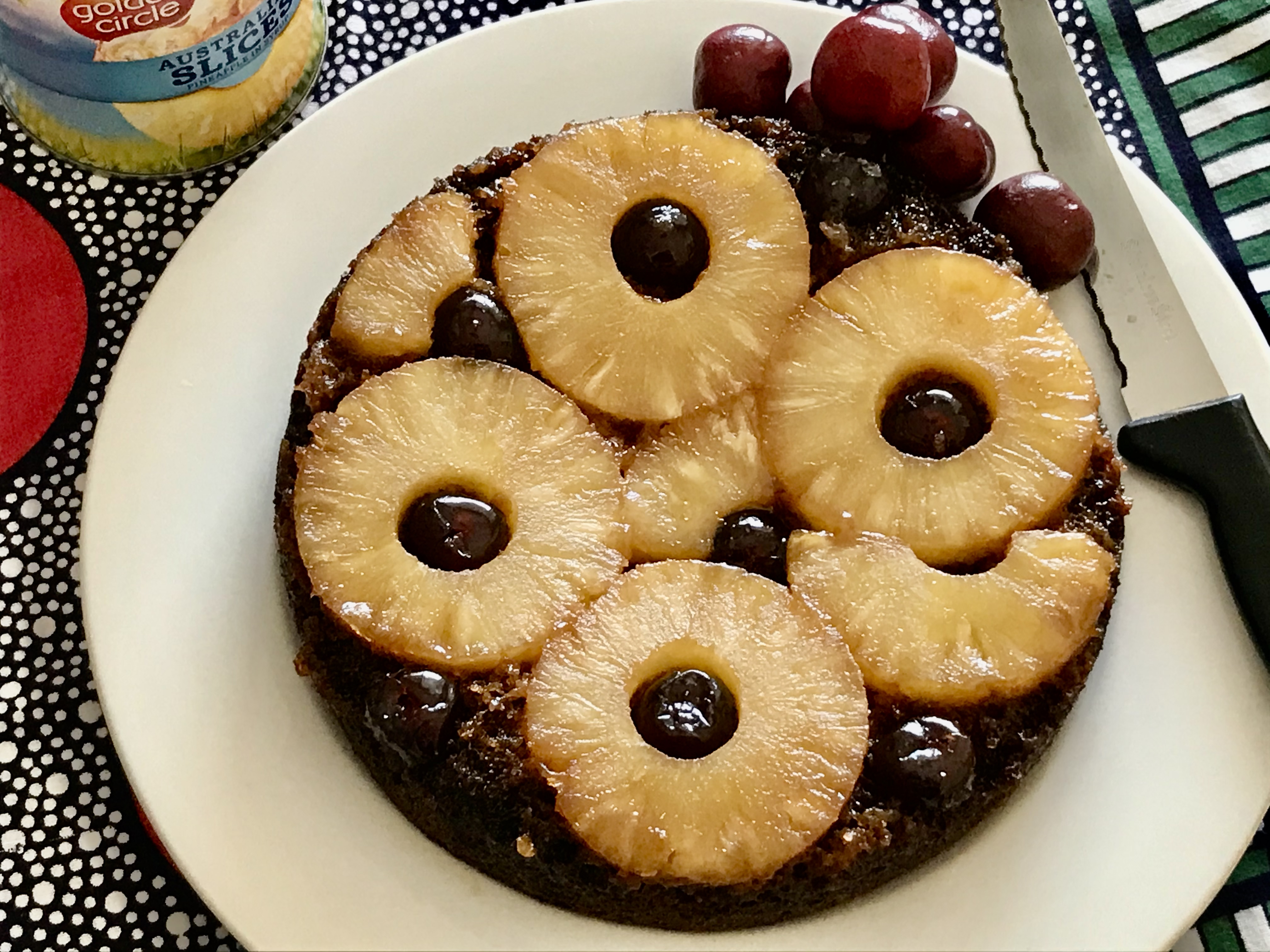 In the England of my childhood, pineapple came ringed or ready chunked—I’m exaggerating, but you get the picture. Now if you trawl the internet for pineapple upside-down cake recipes, many call for fresh pineapple. When I make my cake however, I opt for tinned pineapple and glacé cherries not fresh ones. Because ironically, they seem the more authentic choice. And anyway, Nigella says it’s OK to make this cake with canned fruit and who am I to argue with Nigella? The only alterations to the basic recipe that I consider are a teaspoon of cinnamon and nutmeg (as per a 1953 recipe from Pacific Islands Monthly) or adding ground ginger to the batter and dark rum to the caramel sauce as did a long-ago housemate’s Trinidadian mother.