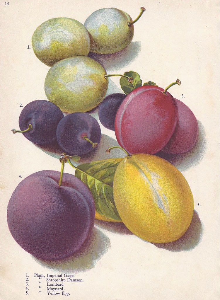 I like cooking with plums—every kind from small, midnight-dark damsons to big red-skinned Victorias—but I also like their common names and the mico-stories behind those names. Here are a few of my favourites from The Plums of England: