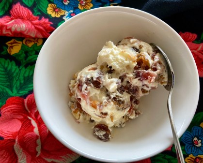 This year I composed my own adaptation for our Christmas dessert: fruitcake ice cream. I soaked sultanas, raisins and dried citrus peel in hot tea for a few hours to soften and plump up. Then I drained them, added glacé cherries to the bowl and soaked the whole lot overnight in brandy. The following day I partially melted a tub of good quality vanilla ice cream, mixed in the dried fruits and put it back in the freezer.